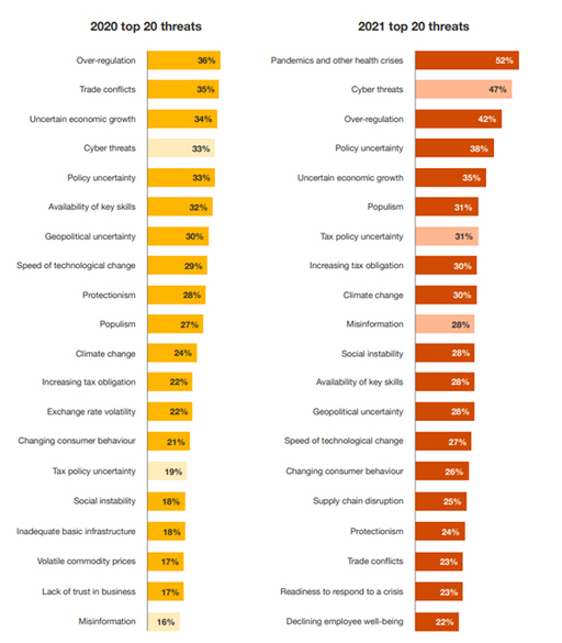 또 디지털 전환의 가속화로 사이버 위협의 리스크가 높아졌다. 이는 2020년 랜섬웨어 공격 등 사이버 보안 사고가 크게 늘어난 것과 맞물렸기 때문이다. 특히 북미와 서유럽에서는 사이버 위협이 코로나19와 같은 감염병보다 더 큰 위협으로 간주했다.