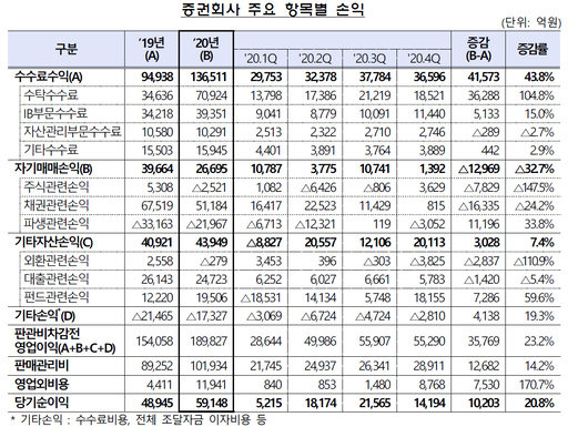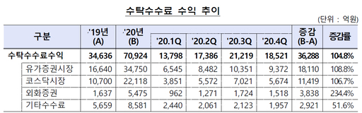 금감원 관계자는 "코로나19에도 불구하고 개인투자자의 주식 투자 확대와 국내·외 주가지수 급등에 따른 수탁수수료 급증으로 증권사들의 실적이 사상 최대치를 기록했다"고 설명했다.