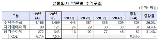 지난해 4개 선물회사의 당기순이익은 343억원으로 전년 대비 82억원(31.4%) 증가했다. ROE는 7.5%로 전년 대비 0.8%포인트 상승했다.