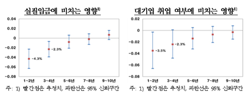 졸업당시 노동시장 충격은 임금 뿐만 아니라 대기업 취업도 힘들었다. 졸업연도 실업률이 1%포인트 상승할 경우 대기업 취업 가능성이 1~2년차에 3.5%포인트, 3~4년차에 2.3%포인트 낮아지는 것으로 추정됐다.
