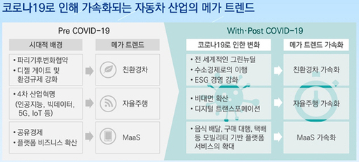 지난해 전 세계 자동차 생산량과 판매량이 전년 대비 두 자릿수 이상 감소했지만, 친환경차·자율주행·모빌리티 서비스로의 패러다임 전환은 더욱 빨라지고 있는 것으로 나타났다. 신종 코로나바이러스 감염증(코로나19)으로 환경보호과 사회적 안전망에 대한 중요성이 커졌기 때문이다.