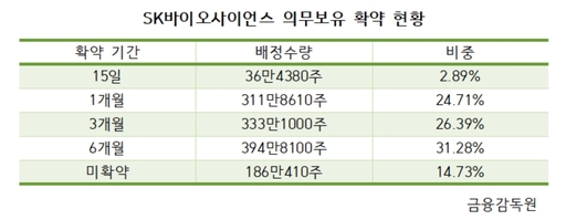 특히 배정 물량의 85.26%에 의무보유 확약이 걸려있어 상장 당일 유통 가능한 물량이 적은 편이다. 금융감독원에 따르면 SK바이오사이언스의 기관 배정 물량 1262만2500주 가운데 1076만2090주가 15일에서 6개월에 이르는 의무보유 확약이 걸려 있다.