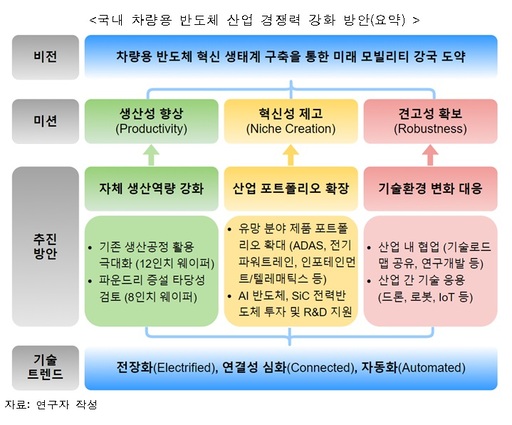 이어 "우선 첨단운전자보조시스템(ADAS) 및 자율주행, 차량 이용자에 맞춤형 서비스를 제공하는 인포테인먼트 기능 등에 활용되는 고성능·고부가가치 반도체의 생산역량 확보와 인공지능(AI) 반도체, 전력 반도체 등 산업 포트폴리오의 다각화가 필요하다"면서 "국내외 기술 협력, 로봇, 사물인터넷(IoT) 등으로 산업 간 경계가 무너지고 있는 기술환경 변화에 전략적으로 대응하는 것도 중요하다"고 조언했다.