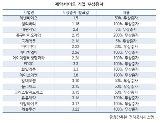 29일 금융감독원에 따르면 올해 들어 17개 제약·바이오 기업들이 무상증자 계획을 발표했다. 이들 중 크리스탈지노믹스, 유유제약, 제일바이오, 제놀루션 등 9곳이 이달 들어 무상증자를 결정했다.
