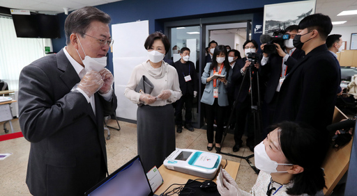 문 대통령 부부는 이날 오전 서울 종로구 삼청동 주민센터에 마련된 사전투표소를 찾아 투표했다. 투표소에 들어가기 전 문 대통령은 입구에서 체온 측정 및 손 소독을 했다. 이어 비치된 위생장갑까지 착용한 뒤 투표소에 입장했다. 지난해 총선과 같이 신종 코로나바이러스 감염증(코로나19) 확산 방지 차원에서 중앙선거관리위원회가 마련한 조치다.