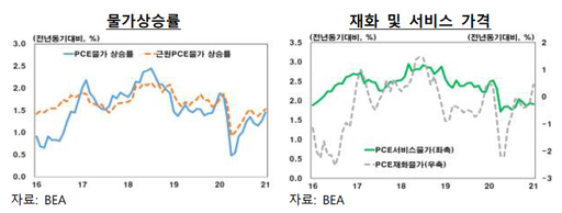 한국은행이 11일 발표한 '해외경제포커스'에 따르면 미국 개인소비지출(PCE) 물가 상승률은 지난해 11월 1.1%에서 12월 1.2%, 올해 1월 1.4%, 2월 1.6%로 상승했다. 지난해 초 신종 코로나바이러스 감염증(코로나19) 확산으로 급락했던 물가는 팬데믹 상황이 개선되고 경제활동이 재개되면서 오름세가 점차 빨라졌다.