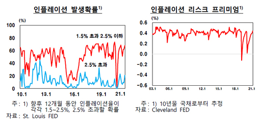 품목별로는 에너지 가격 상승이 최근 물가상승을 주도했다. 이와 함께 코로나19 이후 크게 높아진 식품 가격도 전반적 물가 수준을 높이는 요인으로 작용했다. 한은은 "향후 인플레이션 발생확률은 팬데믹 이전 수준으로 거의 복귀한 가운데 인플레이션 불확실성 수준도 올해 들어 높아진 상황"이라며 "1년후 인플레이션율이 2.5%를 초과할 가능성은 지난해말부터, 인플레이션 리스크 프리미엄은 작년 3월부터 상승세"라고 분석했다.