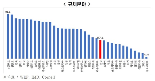 규제분야는 규제의 기업경쟁력 기여도, 규제의 질, 기업규제부담 등 7개 세부항목을 분석한 결과로 하위권을 기록했다. 리투아니아, 스페인과 유사한 수준이다. 세부항목별로는 규제의 기업경쟁력 기여도 35위, 규제의 질 26위, 기업규제부담 25위 등으로 나타났다. 주주보호 규제는 8위로 경영자와 주주 간 이해충돌시 주주보호를 위한 제도가 우수한 것으로 파악됐다.