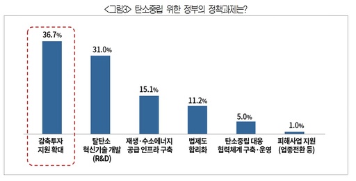 이에 따라 탄소중립을 위해 시급한 정책과제로 '감축투자 지원'(36.7%)과 '탈탄소 혁신기술 개발'(31.0%)을 요청한 기업이 많았다.