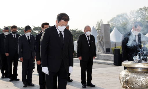 기념탑 앞에 도착한 문 대통령은 화환에 가볍게 양손을 대고 3보 앞으로 이동해 헌화했다. 문 대통령은 헌화 이후 분향하기 전 가볍게 고개를 숙인 뒤 집례관 안내에 따라 세 차례 분향하고, 다시 한번 가볍게 고개를 숙였다.