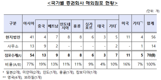 20일 금융감독원에 따르면 지난해 말 기준 증권회사는 14개국에 진출해 70개의 해외점포를 운영 중이다. 현지법인과 사무소가 각각 56개, 14개다.