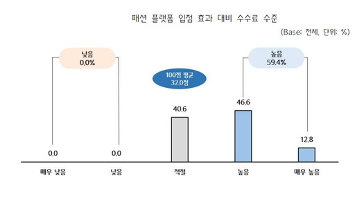 패션 플랫폼 입점 효과 대비 수수료 수준에 대해선 '매우 높다'가 12.8%, '높다'가 46.6%로 59.4%가 '높다'고 답했다.