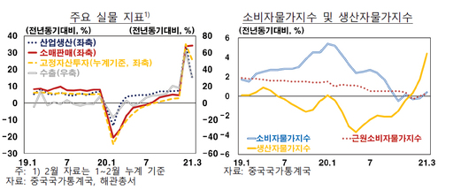 한은은 "미국 정부는 인프라 중심의 1단계 투자계획을 공개한 데 이어 조만간 보육·의료·교육 중심의 2단계 투자계획도 발표할 예정"이라며 "적극적인 재정지출 기조와 신종 코로나바아러스 감염증(코로나19) 상황 개선 등을 감안할 때 향후 회복세는 더 빨라질 것"이라고 전망했다. 중국경제도 성장세가 견조하다. 3월 수출이 높은 증가세를 이어가는 가운데 소매판매도 1~2월에 비해 증가폭이 더욱 확대됐다. 소비자물가도 유가 상승과 서비스업 수요 회복 등으로 전년 동월 대비 상승세로 전환됐다.