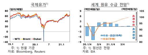 한편 이달 중 국제유가는 두바이유 기준으로 60달러 초반대까지 상승했다. 미국 원유재고 감소세와 백신 보급에 따른 원유 수요 기대 등이 상방 요인으로 작용했다.