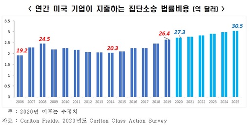 해당 조사에서 응답 기업의 집단소송과 관련한 법률 비용은 2014년 이후 지속적으로 증가하다가 2019년에 26억4000만 달러(한화 약 2조9000억원)로 최고치를 갱신했다.