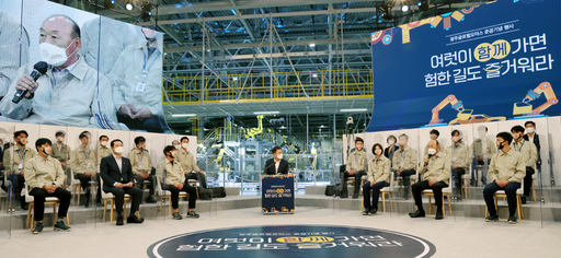 특히 이번 행사는 간담회 형식에 맞춰 ▲동행(광주시장, 한국노총 광주본부의장, GGM CEO) ▲상생(GGM 노동자) ▲희망(산업부 장관, 고용부 차관, GGM 노동자) 등 3개 세션으로 진행됐다. 이와 함께 박광태 GGM 대표 및 임직원 등과 함께 차체 조립 도장 공장 가동 세리머니도 가졌다.