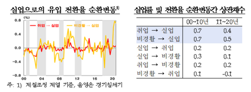 실업률은 글로벌 금융위기 이후로는 경기와 상관없이 추세적으로 높아졌다. 실업으로의 유입 전환율이 하락했지만 취업으로의 유입 전환율이 더 큰 폭으로 하락했기 때문이다. 일자리를 잃은 사람이 늘기보다는 새로 취업에 성공한 사람이 계속 줄었단 얘기다.