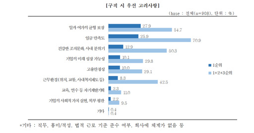 아울러 청년들이 구직시 우선 고려하는 사항은 1순위 기준으로 '임금 만족도'보다 '일과 여가의 균형 보장'이 앞섰다.