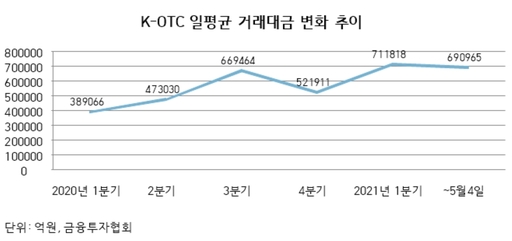 9일 금융투자협회에 따르면 지난 7일까지 올해 K-OTC 일평균 거래대금은 70억4735만원으로 집계됐다. 지난해 일평균 거래대금(51억4755만원)과 비교했을 때 36.9%나 급증했다.