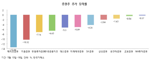 같은 기간 증권주도 미래에셋증권(-5.09%), 한국금융지주(-6.63%), 삼성증권(-2.04%), NH투자증권(-0.37%), 키움증권(-10.32%), 메리츠증권(-13.44%), 한화투자증권(-7.16%), 대신증권(-5.30%), 유안타증권(-1.63%), 교보증권(-0.54%), SK증권(-4.26%) 등이 일제히 하락세를 나타냈다.