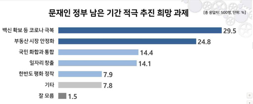 이에 국민은 현 정부가 남은 임기 동안 적극 추진해야 할 정책 과제로 '백신 확보 등 코로나 극복'을 꼽았다. 여론조사기관 리얼미터가 YTN 의뢰로 지난 7일 전국 만 18세 이상 성인 500명에게 '문재인 정부 남은 기간 적극 추진 희망 과제'를 물어본 결과(표본오차는 95% 신뢰수준에서 ±4.4%포인트, 자세한 사항은 리얼미터 및 중앙선거여론조사심의위원회 홈페이지 참조) '백신 확보 등 코로나 극복' 응답이 29.5%로 높았다.