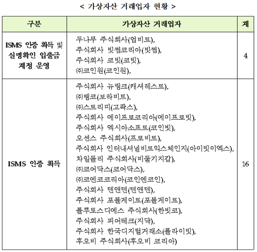 한편 현재 ISMS 인증 획득 및 실명확인 입출금 계정 운영하고 있는 업체는 ▲두나무 주식회사(업비트) ▲빗썸코리아(빗썸) ▲코빗(코빗) ▲코인언(코인원) 등 4곳이다. ISMS를 인증한 곳은 뉴링크, 뱅코, 스트리미 등 16곳이다.