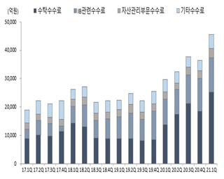 수탁수수료는 2조5216억원으로 전 분기 대비 6689억원(36.1%) 증가했는데, 이는 유가증권 시장과 외화증권 수탁수수료 증가 때문인 것으로 풀이된다.