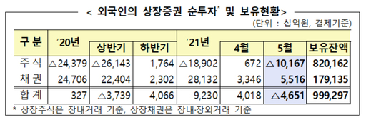 7일 금융감독원에 따르면 5월 중 외국인은 상장주식 10조1670억원을 순매도했다. 코스피 시장에서 9조7260억원, 코스닥 시장에서 4400억원을 팔아치웠다.