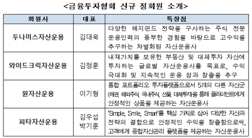 두나미스자산운용, 와이드크릭자산운용, 원자산운용, 피타자산운용 등 4개사가 금융투자협회 정회원으로 가입됐다.