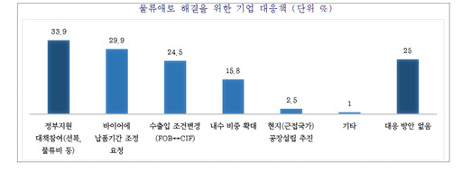 이에 따라 기업들은 물류 애로 해결을 위한 대응책으로 선복 확보 및 운임지원 등 정부지원 대책을 가장 많이 희망했다. 바이어 납품기간 조정을 통해 대응하거나 본선인도조건(FOB)과 운임보험료 부담 조건(CIF)과 같은 무역계약 변경도 주요 대응책으로 꼽혔다.