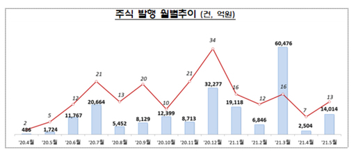 주식 발행은 1조4014억원으로 전월 대비 1조1510억원(459.7%) 증가했다.