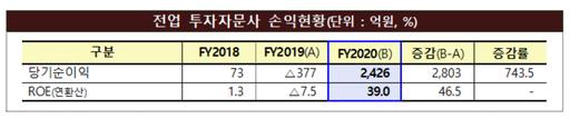 전업 투자자문사의 당기순이익은 2426억원으로 전년 동기 377억원 적자에서 2803억원 증가했다.