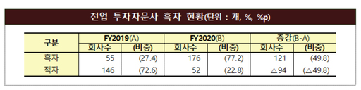 전체 228개사 중 176개사는 흑자, 52개사는 적자를 기록했다. 흑자 비율은 77.2%로 전년 대비 49.8%포인트 높아졌다.