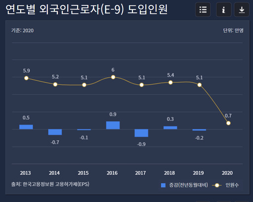 고용노동부 e-고용노동지표에 따르면 2019년 당시 22만3000명에 육박했던 외국인 근로자(E-9) 근무인원은 지난해 5월엔 20만3208명으로 줄어들더니 이후 꾸준히 감소해 올해 5월에는 16만3516만명까지 감소했다. 입국길이 막혀 들어오는 외국인 근로자는 줄고, 코로나19로 인해 고향으로 돌아간 이들은 늘어나면서다.