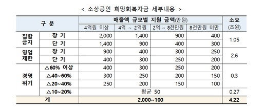 희망회복자금은 ▲집합금지(예산 1조500억원) ▲영업제한(〃 2조6000억원) ▲경영위기(〃 3000억원)로 나눠서 매출액 수준에 따라 차등 지급한다. 집합금지(장기)의 경우 매출이 4억원 이상이면 2000만원, 8000만원 미만이면 400만원이다. 영업제한(장기)은 매출 4억원 이상의 경우 900만원, 8000만원 미만이면 250만원을 각각 나눠준다.