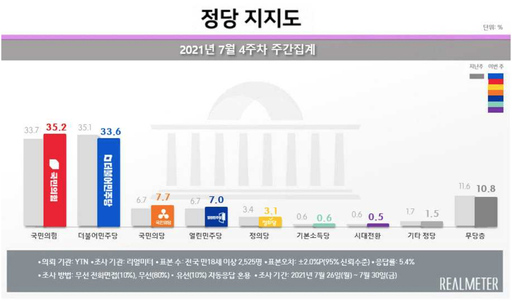 이 같은 지지율 변화는 최근 남북 통신선 복원을 포함한 대북 이슈에 따라 오를 것으로 예상한 가운데 신종 코로나바이러스 감염증(코로나19) 상황이 악화하는 등 효과가 상쇄한 것으로 풀이된다.정당 지지율 조사에서는 국민의힘이 지난주(7월 3주차) 대비 1.5% 포인트 오른 35.2%, 민주당은 1.5% 포인트 내려간 33.6%로 각각 나타났다. 민주당이 2주 연속 하락세를 보이는 가운데 국민의힘은 6주 만에 지지율이 오른 것이다. 양당이 3주 연속 오차범위 안에서 지지율을 유지한 것이기도 하다.