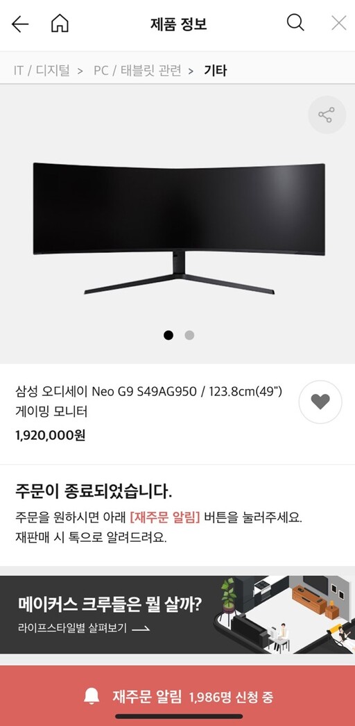 소비자 반응은 뜨거웠다. 삼성전자의 오디세이 Neo G9은 출시일인 지난 29일 카카오 메이커스에서 200대 한정 단독 선판매가 이뤄졌다. 당초 이달 7일까지 진행될 예정이던 이번 판매는 이날 시작한지 1시간여 만에 조기 완판을 기록했다. 현재도 2000명에 육박하는 소비자가 재입고 알림을 신청하며 여전한 관심을 보이고 있다.