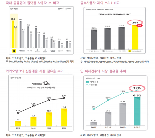 지난 2017년 서비스를 시작한 카카오뱅크는 현재 국내 경제활동 인구의 57%에 달하는 1615만명의 사용자를 확보하고 있다. 월간활성사용자수(MAU)는 1335만명으로 금융 모바일앱 부문 1위다. 중복 사용자를 제외한 MAU는 281만명으로, KB금융(255만명)보다 큰 규모로 은행 내 가장 높은 플랫폼 경쟁력을 갖추고 있다.