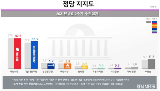 민주당 33.5% 국민의힘 37.3%…2주 만에 오차범위 격차