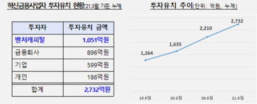 아울러 시장에서 사업성을 인정받는 경우도 늘었다. 혁신금융서비스에 투자된 금액은 벤처캐피탈 1051억원, 금융회사 896억원, 기업 599억원, 개인 186억원으로 총 2732억원의 투자가 이뤄졌다. 2019년 9월(1264억원)과 비교해 1500억원가량 증가했다.