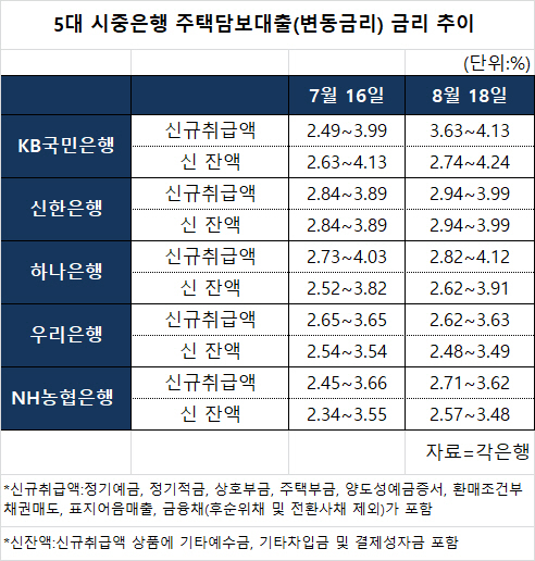 19일 금융권에 따르면 KB국민·신한·하나·우리·NH농협 등 5대 시중은행은 주택담보대출 변동금리를 연 2.48~4.24%로 산정했다. 지난달 16일 연 2.34~4.13%와 비교하면 하단은 0.14%포인트(p), 상단은 0.11%p 상승한 것이다.