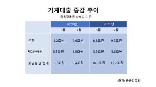 특히 지난달 제2금융의 가계대출 잔액은 전월 대비 5조6000억원 급증해 전년 동기 규모의 3배를 넘은 것으로 집계됐다. 상호금융권의 가계대출 잔액은 농협을 중심으로 2조8000억원 증가했다.