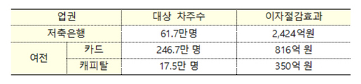 저축은행과 여신전문금융회사는 기존에 보유중인 20% 초과금리 대출을 20%이하금리로 일괄 자동인하했다. 저축은행은 61만7000명의 금리가 인하돼 2424억원의 이자부담을 덜었고, 카드사는 246만7000명의 금리가 인하돼 816억원의 이자가 절감됐다.
