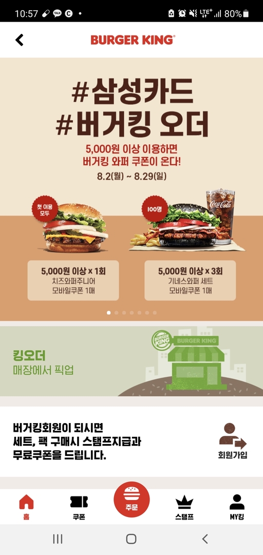 버거킹 오더는 사용자의 현재 위치를 기반으로 주변의 매장을 검색한다. 원하는 매장과 메뉴를 선택한 뒤 수령 방법을 고르고 삼성앱카드로 결제하면 주문이 완료된다.