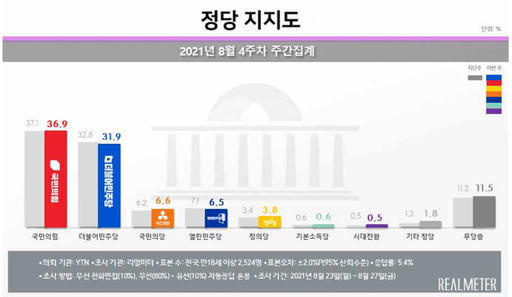 이 밖에 국민의당(6.6%), 열린민주당(6.5%), 정의당(3.8%), 기본소득당(0.6%), 시대전환(0.5%) 순으로 지지율을 기록했고, 무당층은 11.5%로 지난주 대비 0.3%포인트 올랐다.