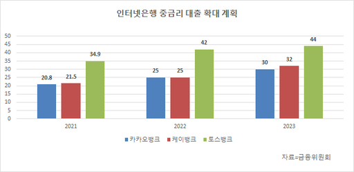 카카오뱅크, 케이뱅크, 토스뱅크 등 인터넷 전문은행도 중금리대출에 집중하는 모양새다. 앞서 카카오뱅크와 케이뱅크는 중금리 대출 목표치를 올해말 각각 20.8%, 21.5%에서 25%로 제시했다. 토스뱅크는 34.9%에서 내년 42%까지 늘릴 예정이다.