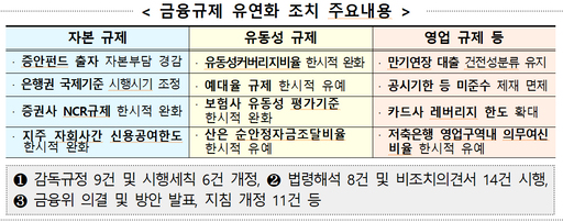앞서 금융위는 코로나19 대응을 위한 금융규제 유연화 방안을 마련해 추진했다. 유연화 방안의 주요내용은 ▲자본규제(지주 자회사간 신용공여한도의 한시적완화) ▲유동성규제(LCR, 예대율 한시적 유예) ▲영업규제(만기연장 대출 건전성분류 유지) 등이다.