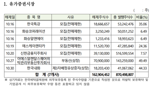 10월 중 52개사의 상장주식 총 3억1007만주의 의무보유등록이 해제될 예정이다.