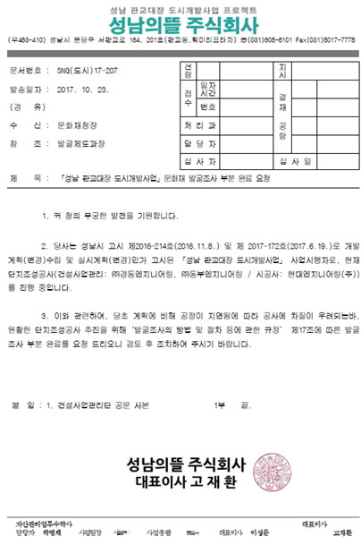 이 과정에서 화천대유는 10월 23일 부분완료 요청을 문화재청에 했으며 10월 25일 승인을 받고 공사에 들어갈 수 있게 됐다.