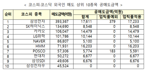 매도 상위종목의 공매도 금액은 삼성전자 1조7000억원, SK하이닉스 8000억원, 카카오 1조4000억원 등으로 나타났다.